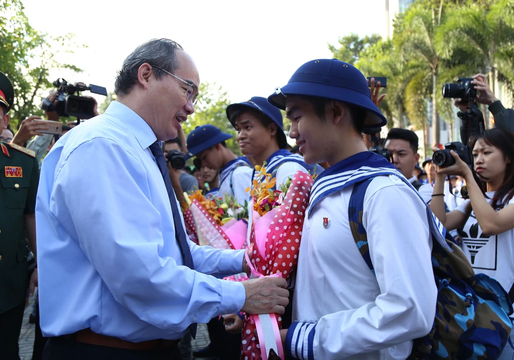Bí thư Thành ủy TP.HCM Nguyễn Thiện Nhân tặng hoa và động viên những tân binh ngày lên đường nhập ngũ.