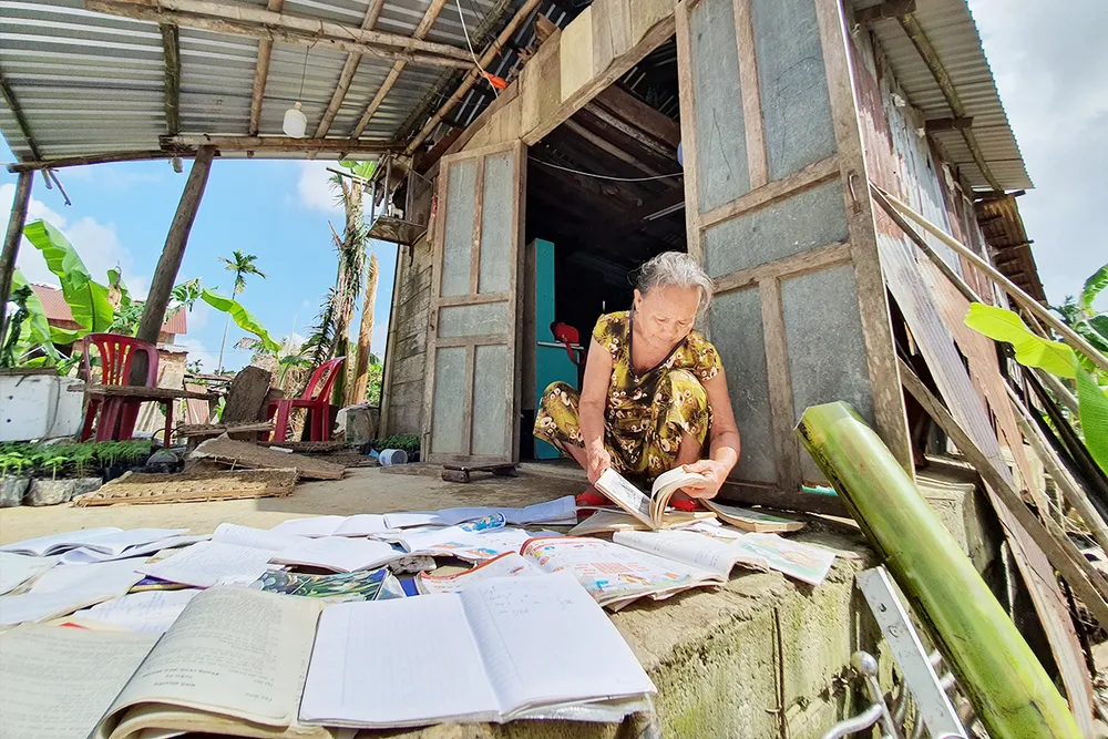 Bà Nguyễn Thị Chưu tranh thủ trời nắng phơi lại sách vở cho hai cháu ngoại. Ảnh: TẤN VIỆT