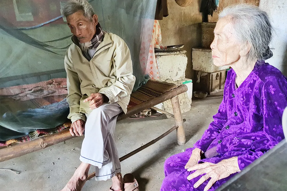 Ông Trần Khả (96 tuổi, chồng bà Miễn) lui cui chống gậy lê những bước chân nặng nhọc từ ngoài xóm về. Thấy chúng tôi, ông Khả giơ tay chào, đôi mắt ngơ ngác.