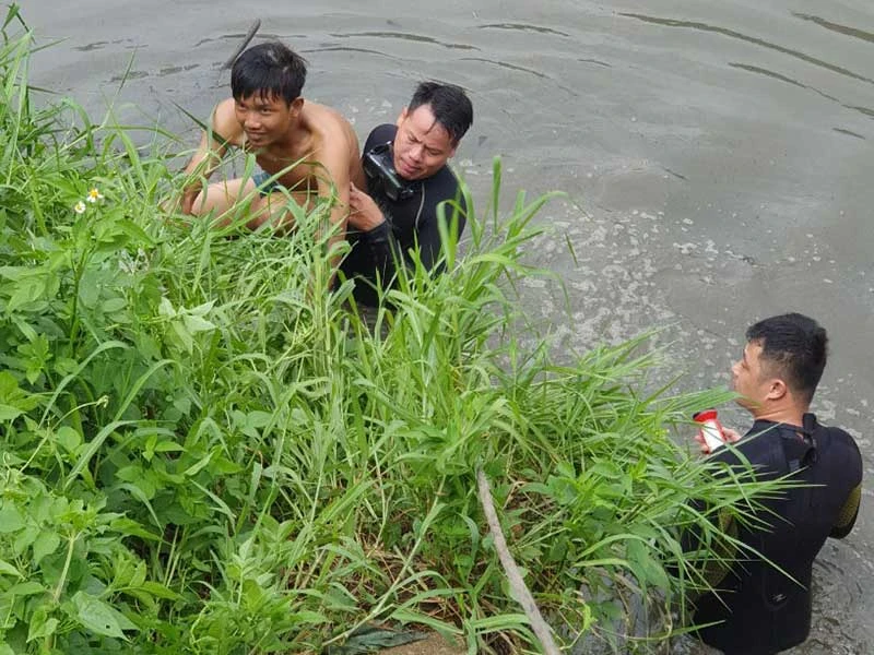 Thượng úy Trần Thành Phát và đồng đội lặn dưới dòng nước bẩn cứu người bị nạn. Ảnh: PCCC