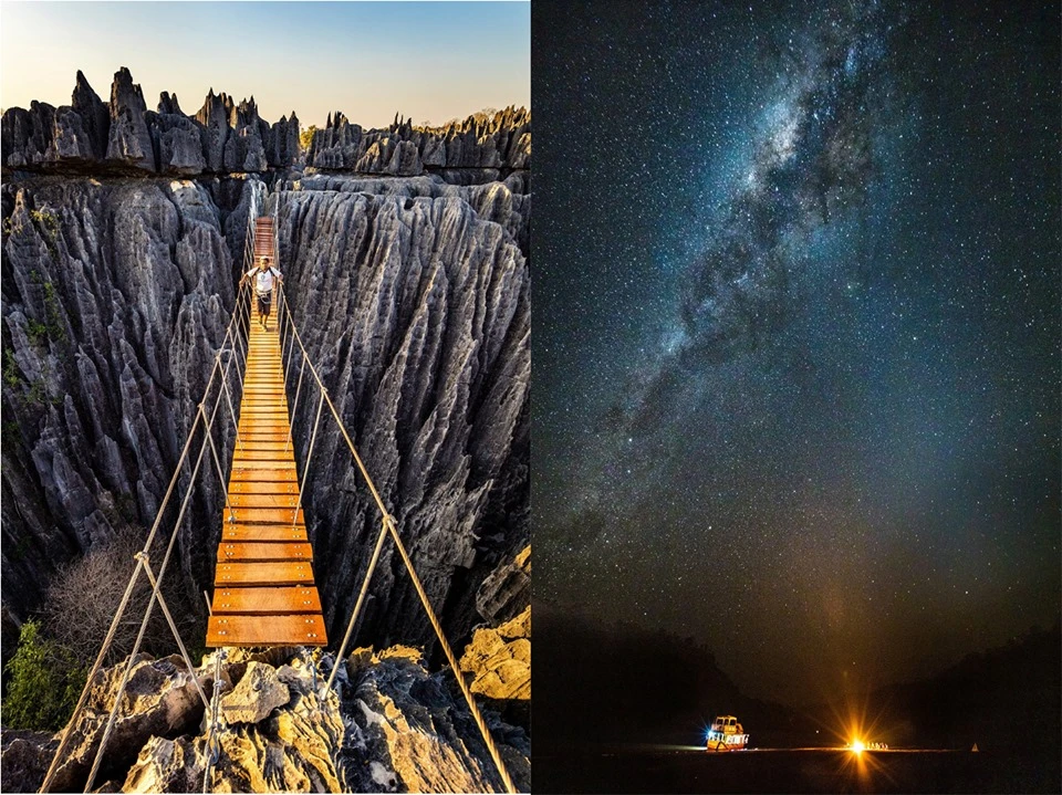 Một cây cầu đi bộ ở Tsingy de Bemaraha và du khách cắm trại dọc bờ sông Tsiribihina