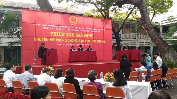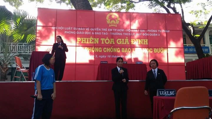 Phiên tòa với chuyên đề phòng, chống bạo lực học đường do Chi hội Luật sư thuộc Hội Bảo vệ quyền trẻ em TP.HCM, Hội Luật gia, Phòng Tư pháp, Phòng Giáo dục quận 3 và Trường THCS Lê Quý Đôn phối hợp thực hiện.