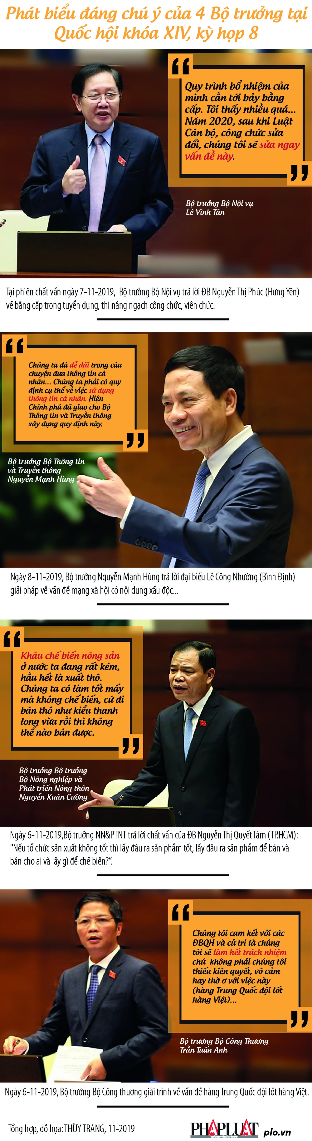 (PLO)- Từ ngày 6 đến 8-11, bốn bộ trưởng (Nội vụ, Công Thương, TT&TT, NN&PTNT) đã trả lời chất vấn trước Quốc hội. Chúng tôi xin trích lại một số phát ngôn đáng chú ý của bốn tư lệnh ngành.