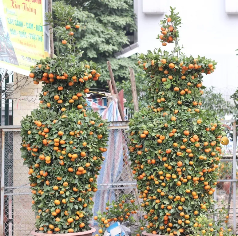 Cặp cây quất hình lộc bình được rao bán với giá 30 triệu đồng. Chủ vườn đã kỳ công uốn hàng ngàn nhánh quất để tạo thành hình dáng đặc biệt này.