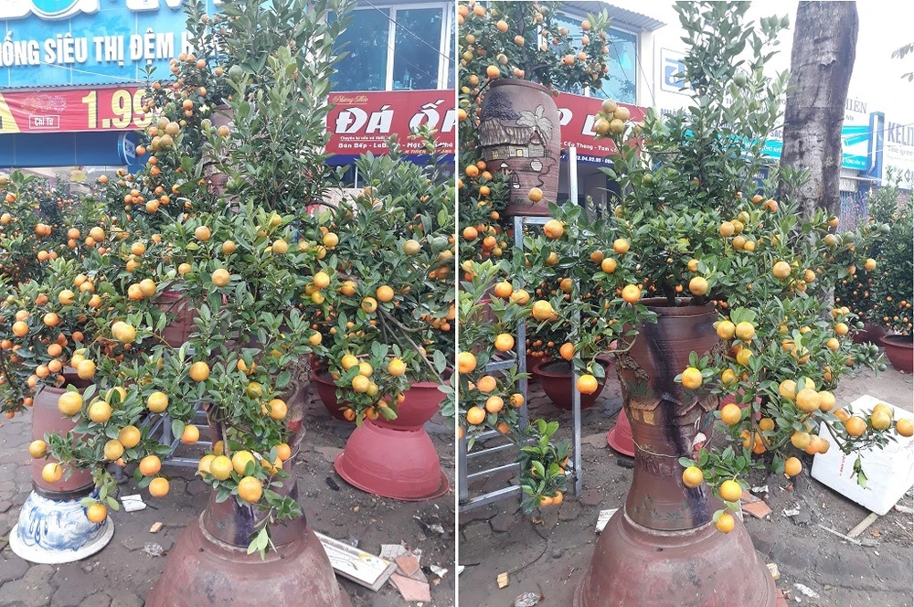 Cây quất cảnh với thế tài lộc trên đường Lạc Long Quân được rao bán với giá 10 triệu đồng. Không chỉ có thế đẹp, cây được trồng trong một bình gốm đắt tiền, có đầy đủ quả chín-xanh, hoa, lá, lộc,...