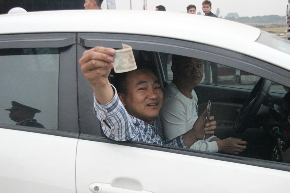 Để thực hiện việc trả tiền lẻ, 3 tài xế trên 3 ô tô dàn hàng ngang tại 3 làn thu phí. Các tài xế đều mang theo những xấp tiền dày mệnh giá nhỏ đã được chuẩn bị từ trước. Tiền chủ yếu gồm mệnh giá 200 và 500 đồng.