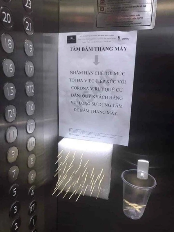 Một chung cư ở quận Đống Đa, Hà Nội đã sáng tạo giải pháp cung cấp tăm để người dân bấm thang máy, sau đó vứt đi. Ảnh: Facebook