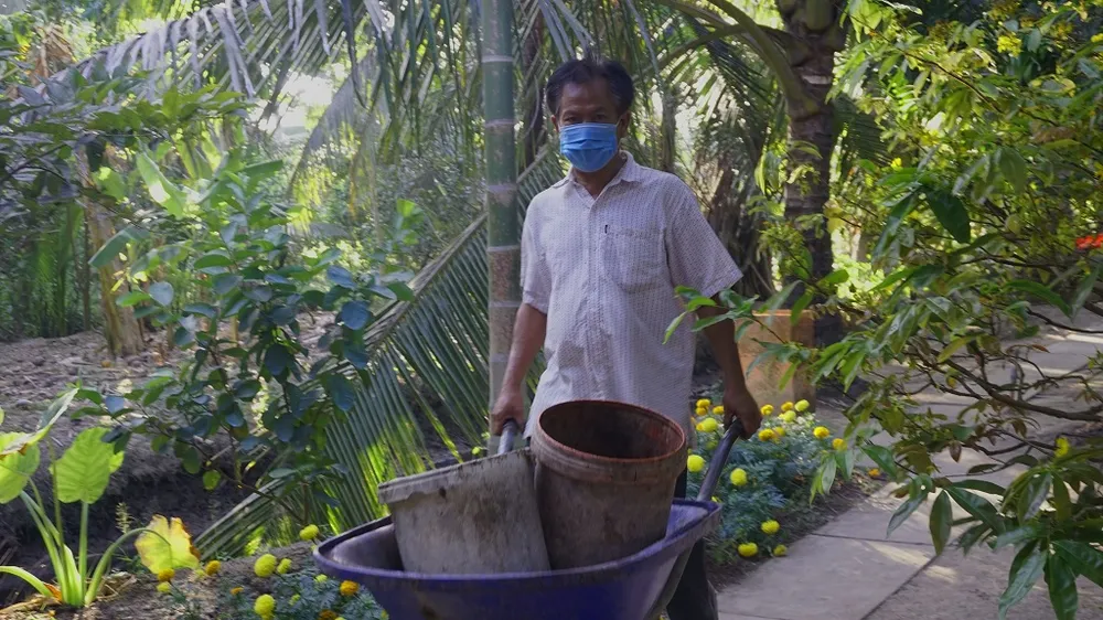 Ông Bảy Thắm (42 tuổi) đã có hơn ba năm làm vườn cho bác Hai Nghĩa. Công việc hàng ngày của ông là tưới cây, nhặt lá đi đốt, quét dọn, tưới phân, nhổ cỏ…