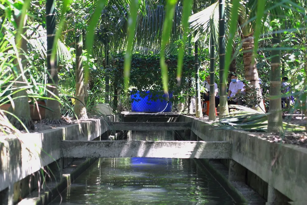 Trong khoảnh vườn được trồng nhiều loại cây trái như dừa, nhãn, bưởi, chuối, bơ…. Nhiều rau xanh và gà vịt cũng được nuôi trồng tại đây. Không gian mát rượi khiến nhiều người nán lại để dạo mát, hít thở không khí trong lành.