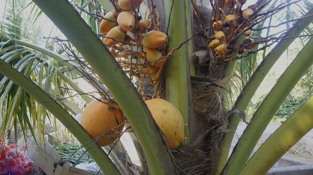 Những cây dừa do bác Hai đích thân mang giống về trồng. Ảnh: NHẬT TIẾN