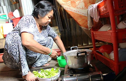 Bà Phạm Thị Năm đang nấu bữa trưa, chiếc bếp ga mini rực lửa, bên cạnh là “cầu tõm” được che tạm bợ (nơi tấm ri-đô buông). Ảnh: VIỆT HOA