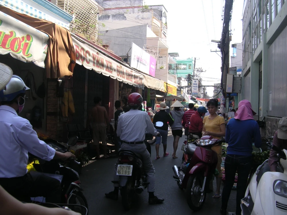 Dòng người tập nập, xô bồ chen chân nhau, xê dịch từng chút một để đi qua con hẻm này.