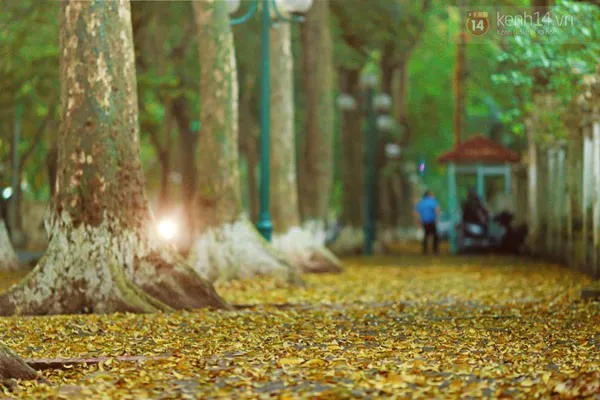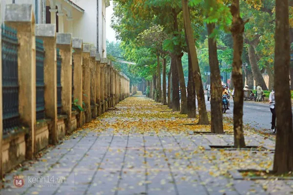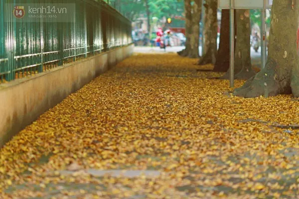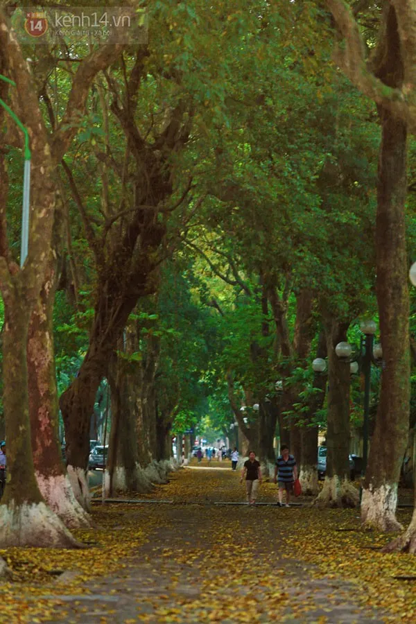 Lá vàng từ hai hàng cây này cũng rụng nhiều khiến con đường như được trải thảm, nhưng đã được quét dọn sang hai bên.