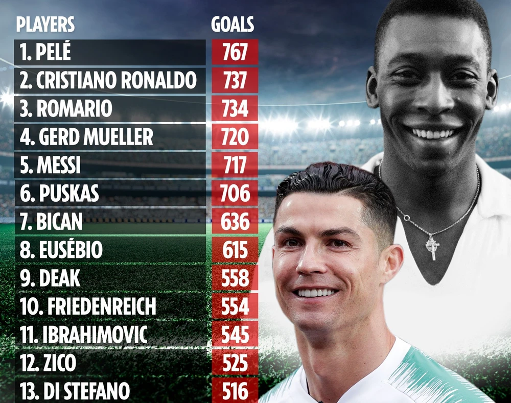 Cần biết Pele nổi tiếng ghi 1286 bàn trong 1363 trận đấu, giúp cựu danh thủ Brazil đi vào sách kỷ lục Guinness, trong đó có 519 bàn thắng trong các trận giao hữu nên không tính cho danh hiệu chính thức. Điều này có nghĩa là Ronaldo 35 tuổi, chắc chắn sẽ vươn lên dẫn đầu danh sách ghi bàn nhiều nhất mọi thời đại trong vòng hai năm nữa. Càng thú vị hơn là đại kình địch Lionel Messi 33 tuổi, đứng thứ 5 trong danh sách với 717 bàn, chỉ kém Ronaldo 20 bàn thắng.