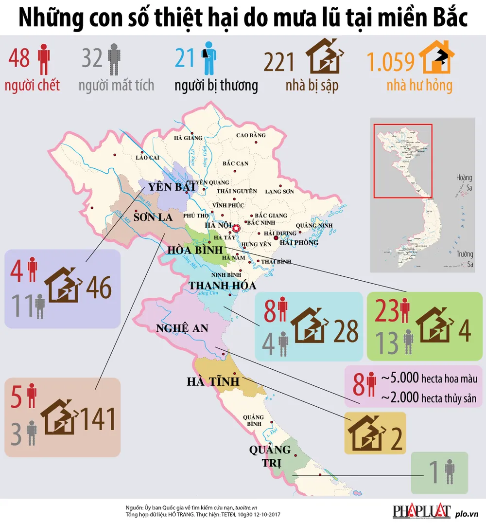 (PLO)- Tính đến trưa 12-10, các tỉnh miền Bắc đã có 48 người chết, 32 người mất tích và 221 căn nhà bị sập trong đợt mưa lũ kinh hoàng diễn ra trong những ngày qua.