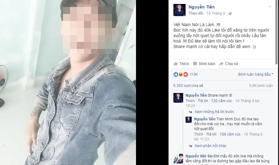 Bức hình này đủ 40k Like, tôi đổ xăng từ trên người xuống lấy hột quẹt tự đốt người rồi nhảy cầu Tân Hoá .!!! Đủ like sẽ làm tôi nói tôi làm! Share mạnh có cái hay hấp dẫn để xem :))”.