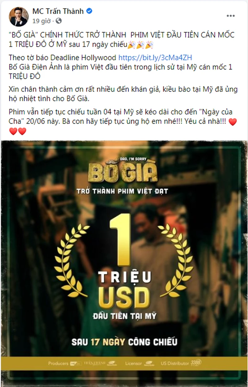Sau 17 ngày công chiếu, bộ phim điện ảnh ‘Bố già’ (Dad! I'm sorry) đã cán mốc 1 triệu đô tại Mỹ.
