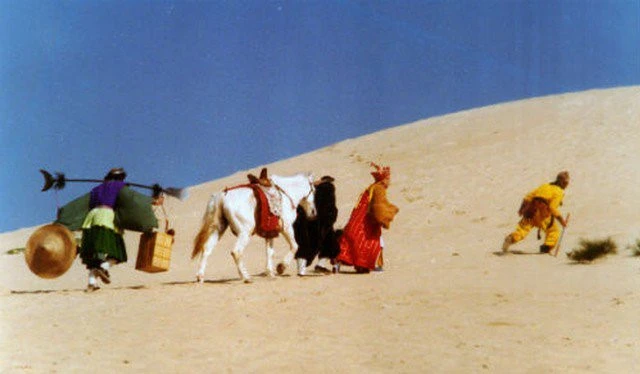 Trên thực tế, Hỏa Diệm Sơn nằm ở rìa phía bắc của sa mạc Taklamakan, Tân Cương. Đoàn làm phim đã thực hiện những cảnh quay ấn tượng trong khí hậu khắc nghiệt của sa mạc và thành Cao Xương bỏ hoang. Ảnh: Phim Tây Du Ký.