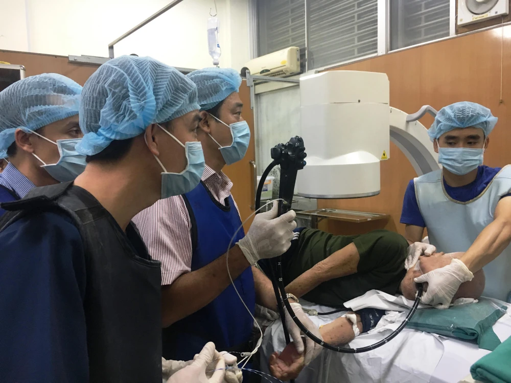 Ăn vội tô hủ tíu dưới căn tin, bác sĩ (BS) Vũ gấp gáp lên Phòng nội soi can thiệp phụ BS Thuận thực hiện ca ERCP (nội soi mật tụy ngược dòng) cấp cứu cho cụ ông 96 tuổi bị nhiễm trùng đường mật do sỏi kẹt đoạn cuối ống mật chủ. Trường hợp này nếu để lâu có thể dẫn đến sốc, tử vong cần nội soi can thiệp lấy sỏi.
