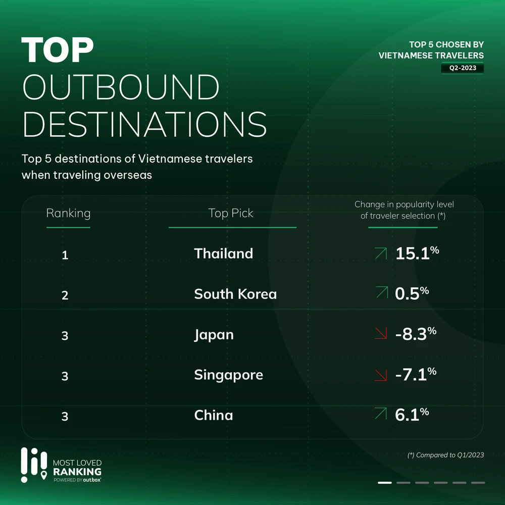 Mới đây, The Outbox Company đã công bố Most Loved Ranking (dữ liệu dựa trên sự lựa chọn của người tiêu dùng, không dựa trên số lượt khách) quý II-2023 với top các điểm đến trong nước, điểm đến quốc tế, đại lý du lịch trực tuyến (OTAs), khách sạn quốc tế được biết đến nhiều nhất...