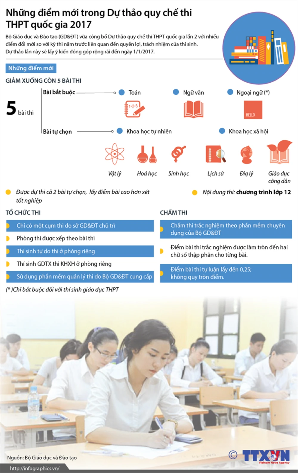(TTXVN) Giáo dục và Đào tạo (GD&ĐT) vừa công bố Dự thảo quy chế thi THPT quốc gia lần 2 với nhiều điểm đổi mới so với kỳ thi năm trước liên quan đến quyền lợi, trách nhiệm của thí sinh. Dự thảo lần này sẽ lấy ý kiến đóng góp rộng rãi đến ngày 1/1/2017.