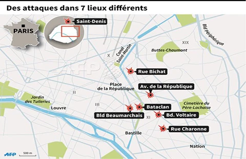 Nhà hát Bataclan: Nhà hát này nằm trên đại lộ Voltair, một khu phố sầm uất giao giữa quận 10, 11 và quận 3 của Paris. Là một trong những địa điểm âm nhạc nổi tiếng nhất Paris, vào thời điểm xảy ra vụ tấn công khủng bố, Nhà hát Bataclan đang là nơi trình diễn của ban nhạc Rock gốc California (Mỹ) Eagles of Death Metal. Theo The Guardian, ban nhạc vẫn an toàn, tuy nhiên “số phận” chuyến lưu diễn của họ vẫn còn là một dấu hỏi.