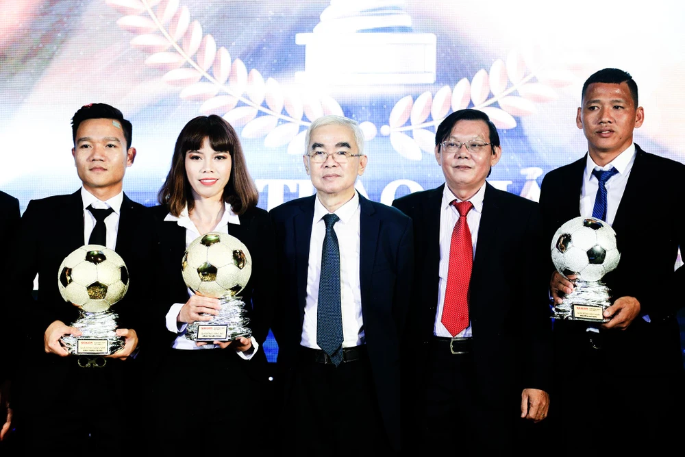 Các cầu thủ đoạt giải chụp ảnh cùng Chủ tịch VFF Lê Hùng Dũng và lãnh đạo báo SGGP