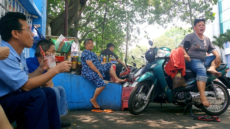 Tại khu vực cấm bán hàng rong, người bán hàng vừa bán lén vừa canh trật tự phường.