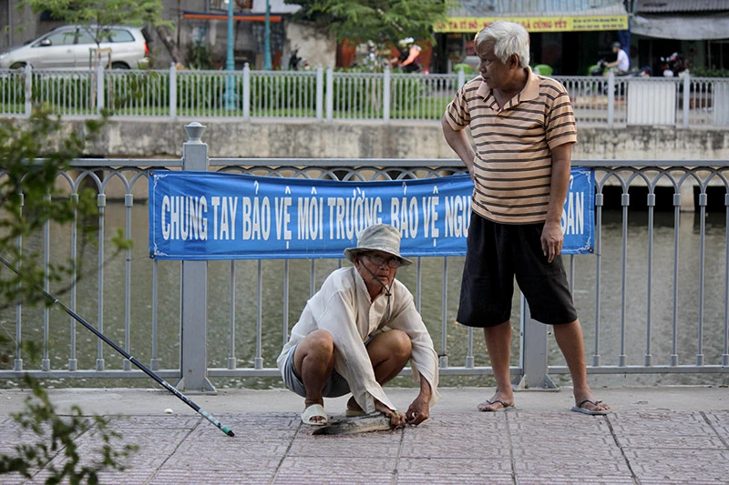 Người dân câu cá bên cạnh tấm băng rôn "Chung tay bảo vệ nguồn lợi thủy sản".