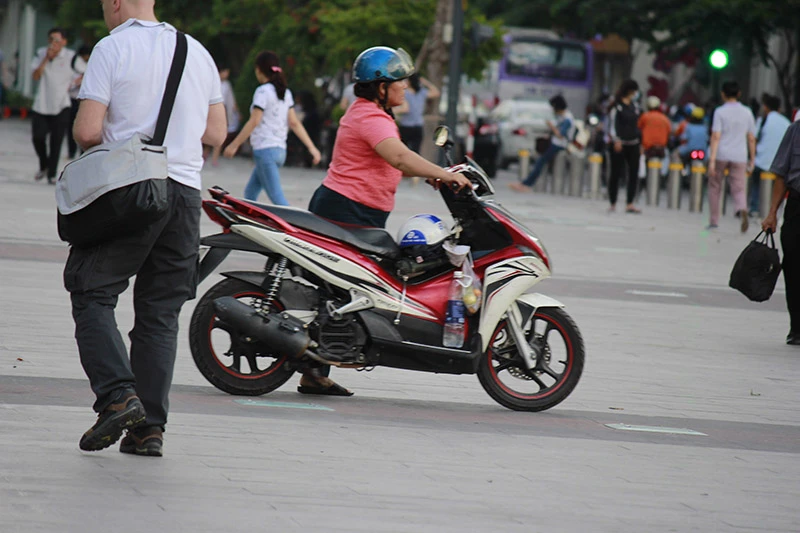 Vì tiết kiệm thời gian nhiều người dắt, chạy xe ngang qua phố đi bộ Nguyễn Huệ bất chấp biển cấm.