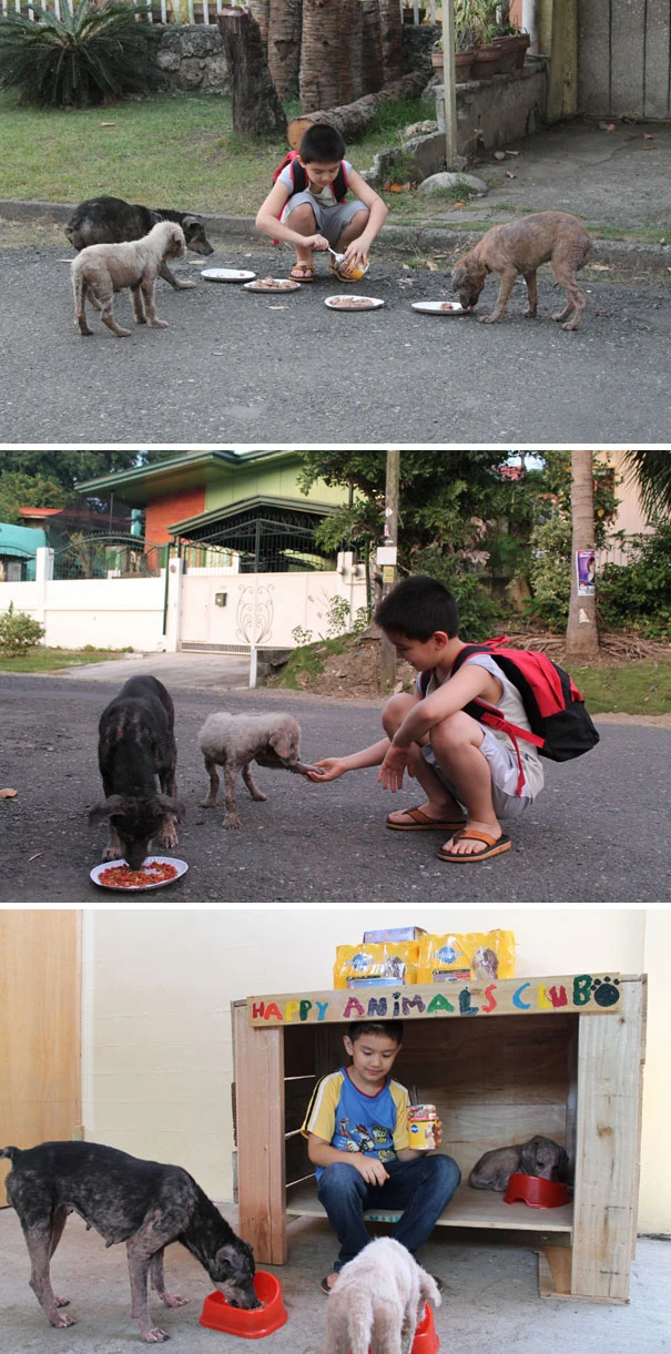 Với tình yêu thương động vật, cậu bé Ken (chín tuổi, người Philippines) đã dựng một chiếc chuồng sau sân nhà mình để nuôi những chú chó hoang.