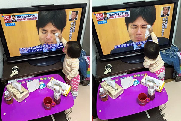 Một bé gái người Nhật đã lấy khăn giấy lau nước mắt cho một chính trị gia người Nhật khi thấy ông này đang khóc trên truyền hình.