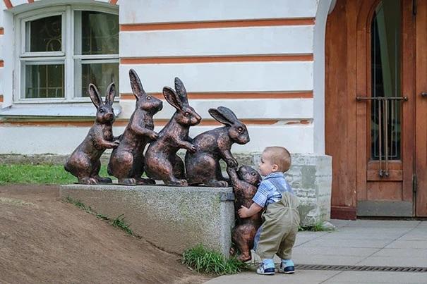 Em bé đáng yêu này đã có ý giúp đỡ chú thỏ bé trên đường.