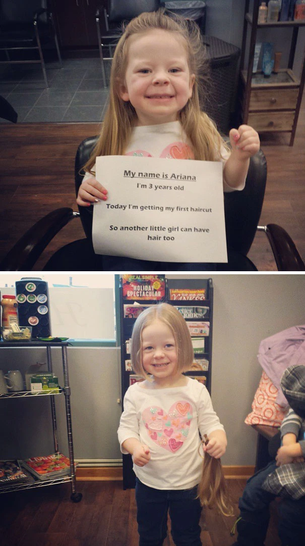 Cô bé ba tuổi Ariana này đã hỏi mẹ: "Tại sao những bạn kia không có tóc?". Mẹ bé giải thích là các bạn bị ung thư và thuốc điều trị khiến tóc các bạn ấy rụng. Vậy là bé bảo rằng: "Con sẽ cho bạn ấy tóc của con" và mẹ bé đã giúp bé làm điều đó.