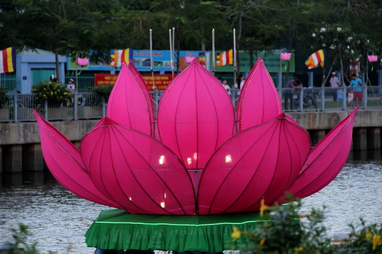 3 đài sen trước tu viện Quan Âm. Những đài sen đã thu hút nhiều người dân xung quanh, hoa sen cao 3m có 24 cánh được kết thành 3 lớp, các đài sen được đặt trải dài trên dòng kênh.
