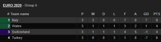 Hiện tại, bảng A, B và C đã thi đấu xong vòng bảng với kết quả Ý, xứ Wales, Thụy Sĩ (bảng A), Bỉ, Đan Mạch (bảng B) và Hà Lan, Áo (bảng C) giành quyền đi tiếp. Trong số này, Thụy Sĩ giành vé vớt cho đội thứ ba có thành tích tốt nhất.