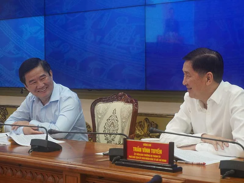 Phó Chủ tịch UBND TP Trần Vĩnh Tuyến (phải) và Giám đốc Sở Tư pháp Huỳnh Văn Hạnh đồng chủ trì hội nghị tại điểm cầu TP.HCM. Ảnh: MINH TÂM