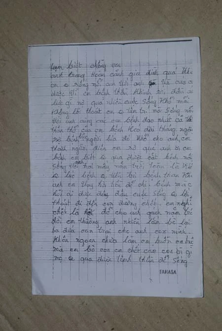 Anh Đoàn (Trần Đại Đoàn, bí thư Đảng ủy xã An Xuyên - PV), em chết rồi còn lại chồng em, anh giúp cho gia đình em được sổ nghèo cho con vay tiền đóng học phí, còn 1 năm cuối mong anh Đoàn giúp đỡ, Ánh còn tiền hụi anh Bảo trả Ánh từ từ. Ráng nhường mà sống nghe Ánh, đừng để khổ chị. Gánh dì bảy, em chết Bảo và con em khổ nhiều mong mấy chị giúp đỡ chồng con em. Đi đến con đường cùng rồi, em không biết nói gì với chế... (chị) hết.