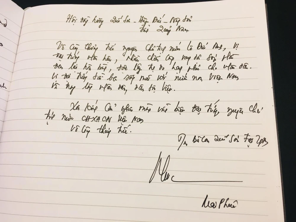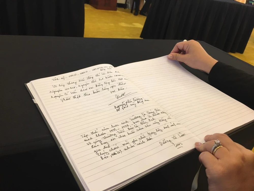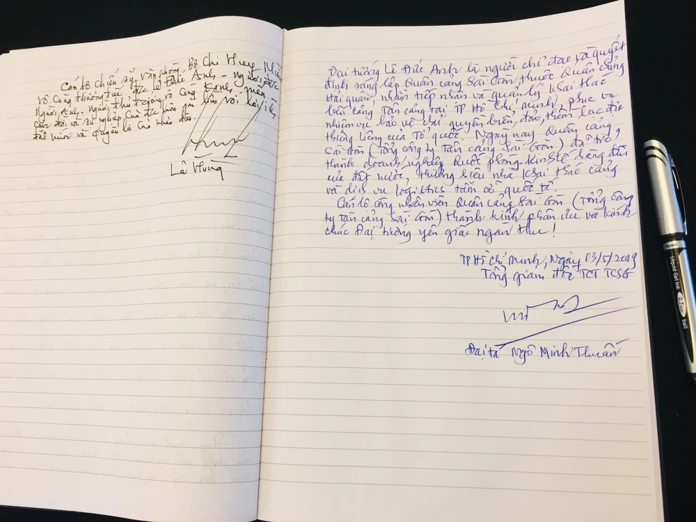 Đại tá Ngô Minh Thuấn đại diện cán bộ, công nhân viên Quân cảng Sài Gòn viết trong sổ tang.