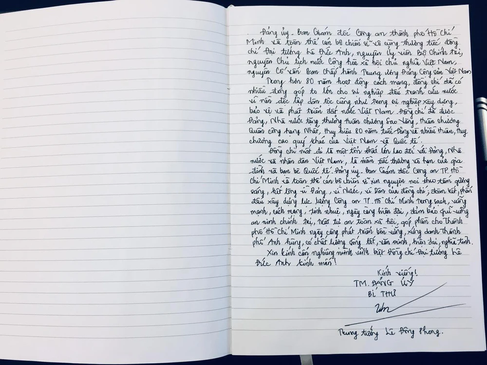 Lời tiễn biệt của Trung tướng Lê Đông Phong-Giám đốc Công an TP.HCM ghi trong sổ tang.
