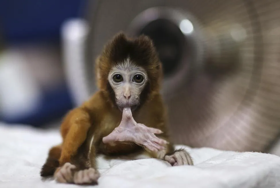Chú khỉ 3 tháng tuổi đang mút ngón tay thuộc công viên động vật hoang dã tại Côn Minh, tỉnh Vân Nam, Trung Quốc