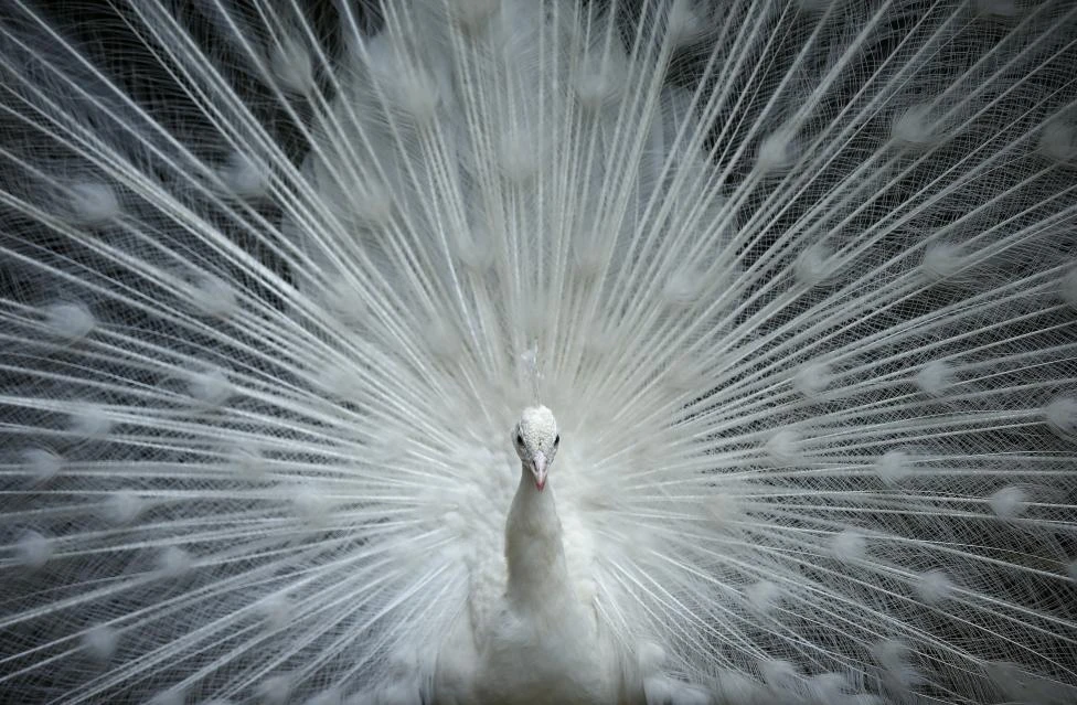 Một nàng công Ấn Độ xòe đuôi tại một vườn thú ở Tbilisi, Georgia.
