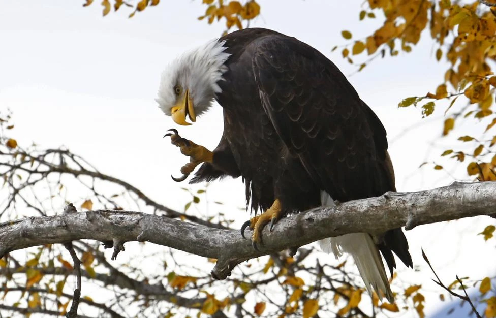 Một con đại bàng hói rỉa móng vuốt trên một cành cây ở khu bảo tồn Chilkat Bald Eagle, gần Haines, Alaska