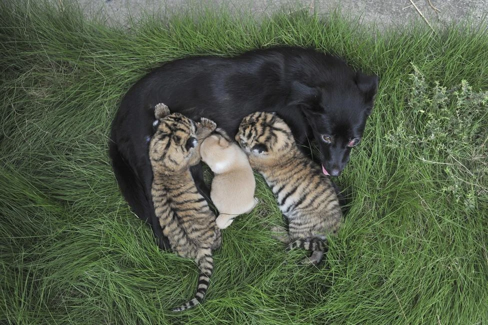 Một chú chó cái đang cho 2 chú hổ con bú tại vườn thú ở Hợp Phì, tỉnh An Huy.