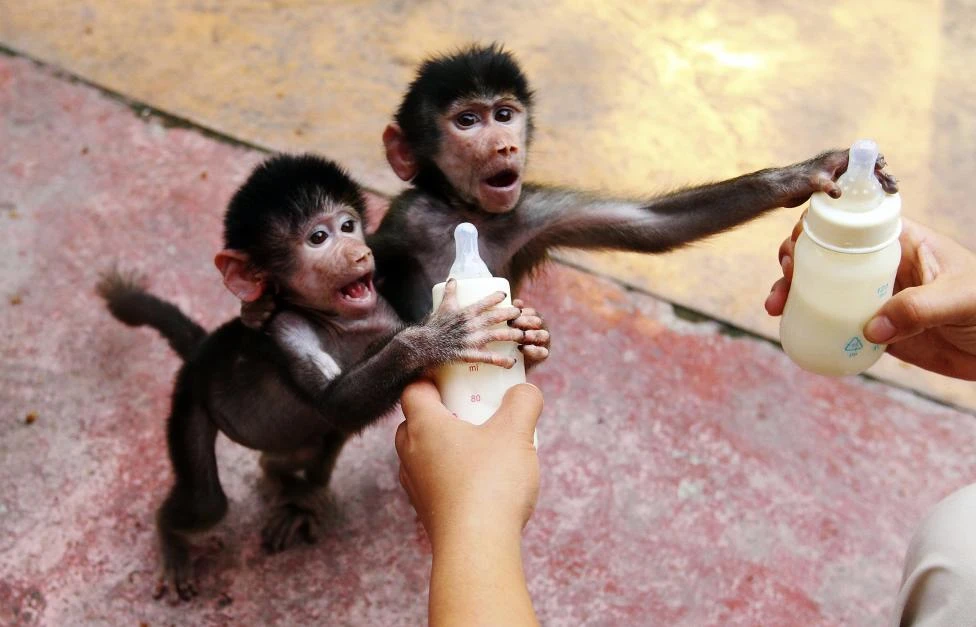 Hai bé khỉ đầu chó Hamadryas nhận sữa từ nhân viên chăm thú tại vườn thú ở Hàng Châu, tỉnh Chiết Giang.
