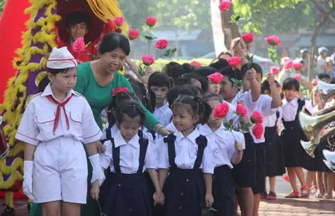 Cô trò Trường Tiểu học Lê Đình Chinh, quận Bình Thạnh hân hoan trong ngày khánh thành trường và khai giảng năm học mới. Ảnh: PA