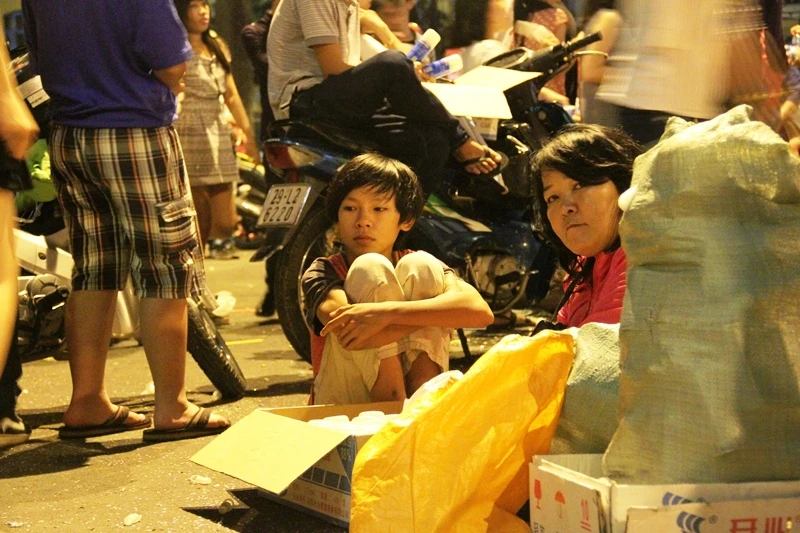 Ở gần đó, xen lẫn giữa thùng carton đựng hàng và bao rác, một cậu bé ngồi ôm gối cạnh mẹ của mình. Cậu lãnh trách nhiệm trông coi hàng, bán bình tạo bọt tuyết cho khách trong lúc mẹ cậu đi nhặt nhạnh những bình tạo bọt tuyết mà người mua chơi xong vứt ra đường cùng các chai nhựa để bán phế liệu.