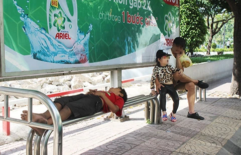T. ngủ mê mệt trên băng ghế chờ xe buýt. Ảnh: H.LAN
