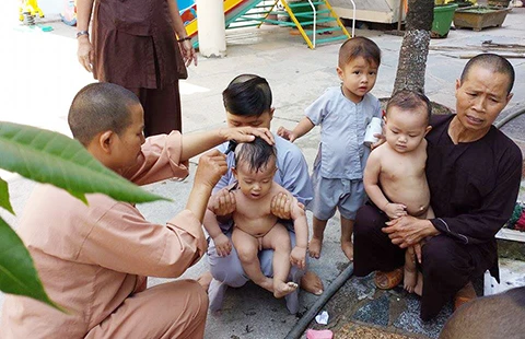 Những đứa trẻ được sư Minh Tâm cạo tóc để chỏm theo đúng nghi thức Phật giáo.