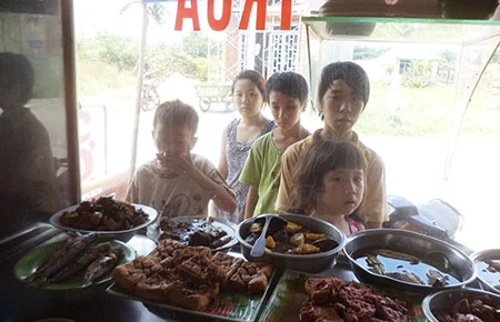 Thu (áo hoa) cùng các em đứng ở quán cơm để ngửi mùi thịt cá và dòm miệng khách. Ảnh: HT